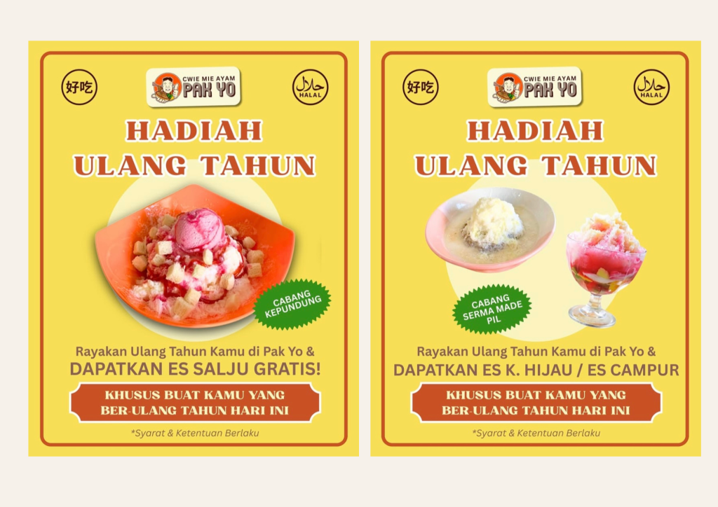 1) Tunjukin KTP mu ke waiter kami, bahwa tanggal lahir dan hari kedatanganmu ke Cwie Mie Ayam Pak Yo sama.